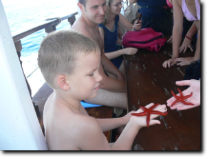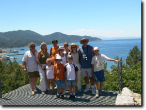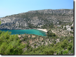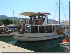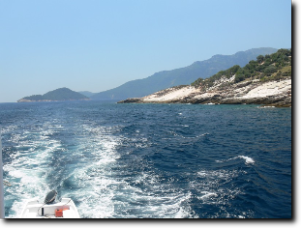 Reggel indultunk, útközben felvettük Ágit és együtt mentünk Limenasba, a kikötőbe. Ott felszálltunk a hajóra, és hamarosan indultunk is. A hajó kelet felé indult. Hajóztunk egy keveset és hamarosan megálltunk horgászni. Mindenki kapott egy műanyagra feltekert vastag damilon lógó horgot, melyen ott lógott a csali. Azt le kellett engedni koppanásig, és egy kicsit mozgatni kellett fel-le. De mivel senkinek nem sikerült halat fogni, továbbálltunk és egy újabb helyen próbálkoztunk. Ott már egy 10 cm-es halat sikerült fognom, de rajtam kívül többet senkinek nem sikerült. Horgászat után lehajóztunk egészen a Paradiso Bach-ig. Az út során többször be-behajóztunk egy két kisebb szép öbölbe. Az egyik öbölben megálltunk és lehetett úszni, búvárkodni , ugrálni. Mi mindannyian bementünk a saját búvárszemüvegekkel és az Ágitól kapott uszonyokkal. Szép víz alatti helyeket láttunk. Ági hozott fel mutatóba tengeri csillagot, tengeri sünt és sünházat. Sünt és sünházat már többet szedtünk előtte mi is, de a csillag az újdonság volt. Paradisonál volt a következő hosszabb megálló, ahol ismét búvárkodtunk. Közben készült az ebéd. Mikor elindultunk visszafelé, elfogyasztottuk a finom ebédet. Az úton végig csodáltuk a tájat. Nem győztük kattintgatni a fényképeket. A következő és az egyben utolsó megállás a "márványparton" volt. Itt nekünk megint búvárkodás volt a program. A kevésbé jól úszókat csónakkal vitték ki a partra. A visszafele úton fiam elpilledt, mi pedig beszélgettünk Ágival.