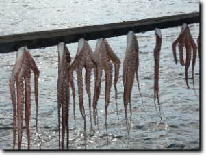 Felkerekedtünk és elmentünk Tripiti Beach-re. Persze útközben többször megálltunk fényképezni és gyönyörködni a tájban. A part itt aprókavicsos, bent pedig érdekesen sziklás és eléggé hirtelen mélyül. Itt a srácokkal búvárkodtunk, és megnéztük a barlangot. Itt fogtunk először polipot is. Nagyon érdekes állat. Még szerencse, hogy valami bébi lehetett, mert különben biztosan rémisztőbb lett volna. Ahogy úszott, lövelte ki a tintát, hogy elijesszen minket. Fürödtünk egy ideig, a gyerekek betemettek kaviccsal és lassan továbbmentünk, mert számunkra nem volt túl vonzó az aprókavics. Ha már part, akkor vagy sziklás legyen, vagy homokos, ezt a köztes állapotot nem nagyon szeretjük. Visszafele megnéztük a Metalia Beach-et, de itt nem fürödtünk.