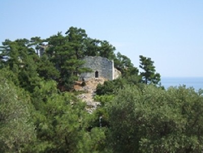 Menetbe szerettük volna megnézni a szirének medencéjét, de nem vettük észre a táblát, hogy hol kell lekanyarodni, így ez kimaradt. A kolostor megtalálása nem volt nehéz, mert közvetlenül az út tenger felőli oldalán van, Aliki után. Mivel a kolostorokba csak megfelelő viseletben lehet belépni, szoknya gyanánt vittem egy nagy strandkendőt, ám előrelátásom hiábavalónak bizonyult, mert a kapus bácsi nem volt megelégedve és fel kellett vennem egy szoknyát. Misi is kapott egy csini nadrágot, Gergőt beengedték sortban. Belépődíjat nem kellett fizetni. Fényképezni, videózni nem lehet, azonban mi sem álltuk meg, hogy egy-egy tájképet ne csináljunk. A kolostorban intenzív építkezés folyik, ezért csak igen kis része látogatható.