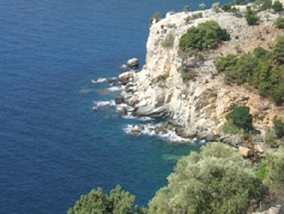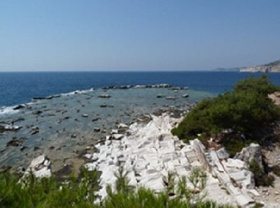 Még a nagy meleg előtt azért felderítettük a félsziget rejtett kincseit. Sok ösvény fut minden felé, érdemes ezeken egy kicsit bolyongani. Mi azon indultunk el, amelyik a taverna sor végén kezdődik egy meredek kaptatóval, de aztán jól járható ösvénnyé szelidűl a hegy oldalában. Az enyhén emelkedő út hamarosan eljut a félsziget végéig, ahol elénk tárult az ókori márványkikötő.