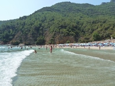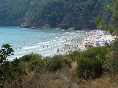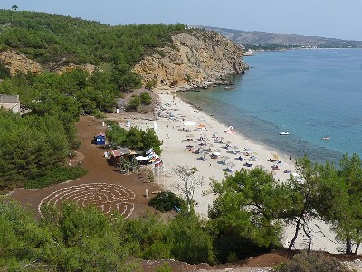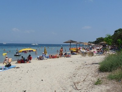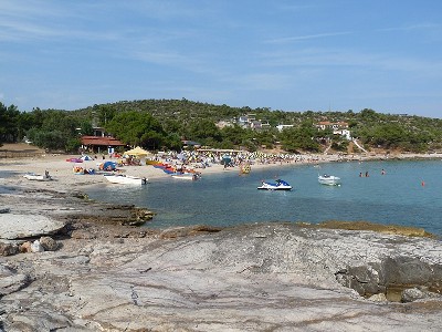 Homokos part - olyan grízszerű a homok -, lassan mélyülő tenger. Főleg görög fiatalok által látogatott strand tavernákkal, vízi sportolási lehetőségekkel. Bár a zene kissé hangos volt (és modern), de nem volt annyira zavaró, hogy eltántorítson bennünket attól a szándékunktól, hogy a délután hátralévő részét itt töltsük.