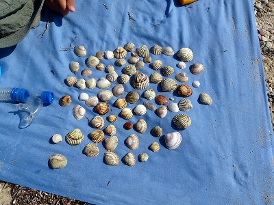Hétfőn irány Prinos és a piac. Korán akartunk indulni, de Gergőbe alig lehetett lelket verni. Volt már 9 óra is, mire elindultunk. Könnyen megtaláltuk a piacot: zöldség-gyümölcs és vásári bazár, a szokásos, no és persze jó sok ember. Egyszer csak összefutottunk Ágival, bizonyára a szigetkerülő fakultatívra vitte a csoportot. Végül is barackot, szőlőt és némi édességet vettünk. Elindultunk vissza Skala Prinos felé. Megnéztük a kompkikötőt (éppen érkezett egy komp) és a környékét, a hajójavító műhelyt. Feladtam a képeslapjaimat, amiket már napok óta hurcoltam magammal, de mindig elfelejtettem bedobni őket egy postaládába. Skala Prinos addig látott strandjai nem igazán nyerték el a tetszésünket, ezért elindultunk a hajójavító műhely előtti úton dél felé. Néhány km megtétele után, majdnem az aszfaltos út végén találtuk meg azt a partszakaszt, amilyet strandolás szempontjából kerestünk. A part homokos. A vízben eleinte a talaj homokos, majd egy kb. 5 méter széles sávban köves-kavicsos (nem túl mély, de sünös- átúsztunk fölötte). A víz bentebb sem túl mély, de nem is mondanám sekélynek. Gergő itt sokat búvárkodott, szép kagylókat talált.
