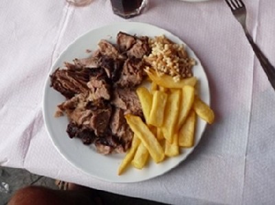 Rendeltünk is egy-egy adag sertéssültet, ami a nyárson forgolódott, plusz három kólát és tzatzikit.