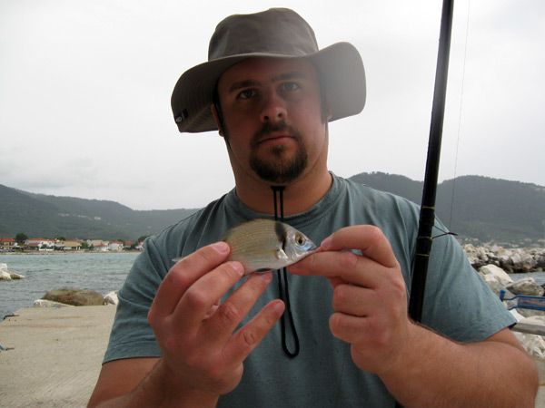 Tehát megérkezésem napján, pár órás pihenőt követően fütyörészve bandukoltam le a tengerpartra, ahol kiszemeltem magamnak egy helyes kis kikötőt. Odaérkezve összeállítottam a botomat és már repült is a szerelék a sós habokba. Rögtön elkezdték piszkálni a csalit halak és láss csodát, eltűnt az úszó. Bevágtam és már a parton is ficánkolt az első tengeri halam, egy kis csíkos sügér, ami sajnos felfelé kerekítve is csupán 3 centi hosszú volt. Sebaj, de legalább megvan az első tengeri! Ám, az események nem várt fordulatot vettek. A kikötőben a görög halászok elég csúnyán összevesztek. Bár nem értem a görög nyelvet, de olyan gesztusokat tettek, amik magyarul is hasonlóan értelmezhetőek... :) Valaki elfoglalta a másik csónakhelyét, ezen robbant ki a viszály. Úgy döntöttem, hogy nem várom meg, míg kirobban a második peloponnészoszi háború, így átmentem a móló tenger felőli oldalára, hátha itt nagyobb sikerben lesz részem.