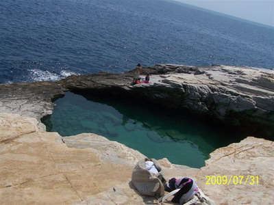 Aztán elértük a medencét. Hát, ez tényleg szép! Körben mindenütt a sziklás part, ami lépcsőzetes, hatalmas kövekből áll, előtte pedig a végtelen tenger! Imádom az ilyen tájat!