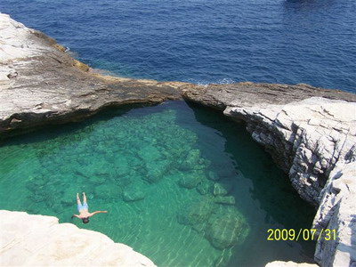 Nem volt nagy szél, teljesen jól be lehetett mászni (na, azért ez sem egyszerű dolog már egy ilyen korú nőnél). A szélére ültem és a két kezemmel tartva magam tudtam beleereszkedni. Kifelé? Csak segítséggel! Rátettem a lábam egy kis tenyérnyi sziklára a befelé lejtő medence falán, aztán a férjem kezét megragadva, kihúzott a vízből. Persze közben humorizált; na szia, majd jövőre találkozunk!