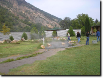 Aztán, mivel minden jó véget ér egyszer, elérkezett a búcsúzás napja is (szept. 18.). Aznap tökéletes napfelkelte örvendeztetett meg minket. De hát el kellett indulni. Komp - Keramoti - Kavala - Drama - és innentől északnak vettük az irányt. Megnéztük az Angitisz cseppkőbarlangot. A környezetét, a parkolóban az infrastruktúrát most építik ki, ott dolgoztak a munkások, jövőre már biztos teljes turistafogdosó létesítményrendszer várja az odatévedőket. A barlang szép és érdekes, a mai turistakijáratnál, ami ugye az egyik régi bejárat, vizimalom volt, ott áll a kerék. Hát igaz, ami igaz, a magyar cseppkőbarlangok után (meg mi láttuk Szlovéniában a lélegzetelállító skocjani barlangot is) nem egy nagy durranás, de érdekes. Ami meglepett, hogy ezen a déli vidéken - igaz, hogy magasan van - a barlangból kicsobogó folyó mellett ciklámen virágzik.