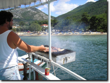 A hazaúton megkerestük Limenasban a (ha jól emlékszem) Thassos Travel irodáját, ahol befizettünk az Eros II hajó szigetet megkerülő útjára. Hát ez nem egészen úgy sikerült, mint szerettük volna. Csöpörgött, mikor indultunk, aztán komolyan esőre váltott, a hajó gerendáin meg (belül) elindultak lefelé a festékkel dúsított vízcseppek... De odébbülni se nagyon lehetett, mert két kézzel kellett kapaszkodni, ugyanis a hullámok nagyon dobálták a kis hajót. Többen tengeribetegek lettek. Életem párja azt hajtogatta eddig, hogy nagyon szeretne átélni tengeri vihart... Néhányan jöttek a büféhez piát vásárolni, a személyzet meg kezdte készíteni a salátát, - csitt-csatt-csörr, többször nagy csörömpöléssel felborult minden a büfépulton belül. Nyugatnak indulva elértünk Skala Marionig, ott a keskeny öbölben ki akarták szállítani az az utasokat a csónakkal, de végül letettek róla. Az eső még jobban rákezdett, a hajó meg úgy himbálózott, hogy a víz az egyik szélétől a másikig ért. Visszafordultunk - sajnos nem mentünk körbe, bánatos vagyok - és már nyugodtabb vizeken visszajöttünk Skala Rachoniig, ahol a merészek kimentek fürdeni, a személyzet meg megsütötte a "barbeque" húst. Mikor a strandolók visszaértek, megtörtént az etetés. Mi közel ültünk, a görögsalátából repetát is kaptunk. Csak hát a húst az ölünkben kellett nyiszitálni. Aztán visszahajóztunk Limenasba, kicsit korábban a tervezettnél.