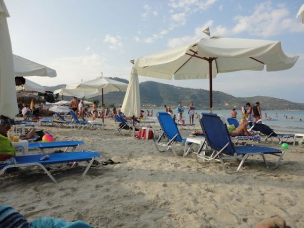 És itt történt meg az a hihetetlennek tűnő pillanat, hogy egyszer csak kisütött a nap, nem is akárhogy, minden erejét latba vetette. Több sem kellett nekem, ezt jelzésként fogtam fel, azonnal menni akartam a mi kis Golden beachünkre fürdeni. De rögtön. Máris. :) És lám, jó 40 perc múlva már ott süttettem a hasamat a strand centrum partszakaszán, és fürödtem a jó meleg tengerben. A víz nagyon lassan mélyül, jó sokáig be kell menni, ha az ember úszni akar, de ettől függetlenül elnyerte tetszésünket. A napernyőért és a két ágyért fizetni nem kellett, csak fogyasztani valamit, ez így megérte, hiszen úgyis ittunk mindig valahol egy-egy frappét, így ezt itt tudtuk le. Rengetegen voltak a strandon, sokan kisgyermekkel, de nem éreztem a konzervdoboz effektust. Ahogy a nap előjött, rögvest forrón tűzött, ezt csak a vízben lehetett elviselni. Mögöttünk végig a sétálóutca (ezzel a kifejezéssel talán nem lövök mellé ) húzódott, ahonnan finomabbnál-finomabb illatok csábították a megfáradt turistákat egy-egy vacsorára.