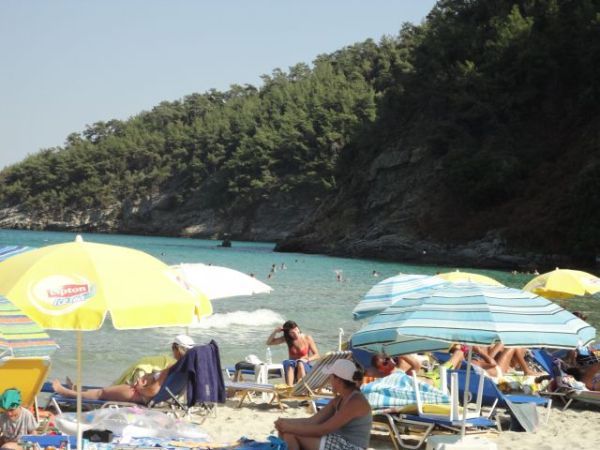 A parton emberek és napágyak tömkelege várt minket, valahol középen pont volt egyetlen szabad ágy – szerintem kizárólag ránk várt :) - ahová letelepedtünk. A mély homok forró volt, szinte égette a lábunkat, a víz viszont hűsítő, lassan mélyülő, hatalmas hullámokkal, amit nagyon élveztünk, a Golden beachnél egyedül ezt hiányoltam. Itt is nagyon szép kék a víz, s bár a parton tömeg volt, érdekes módon a vízben annyira nem. A napernyők alatt hűsölt inkább mindenki. Érdemes volt ellátogatni ide, csak a fel- és levezető út nem volt valami fényes, maga a part gyönyörű, a hullámok, a környező hegyek, sziklafalak látványa (és nem utolsósorban a rajtuk ugrándozó kecskék) igazi kikapcsolódást nyújtanak. Egyetlen vendéglátó egysége van a helynek, ahol enni és inni is lehet, bár ez is eléggé tömve volt, és nem is volt túl olcsó. Csak vizet vettünk és kávét, mert még volt pár szendvicsünk és péksütink.