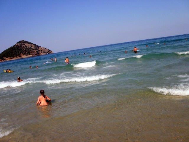 Ahogy utunkat folytattuk, megnéztük a közkedvelt strandokat, láttuk a Paradicsom beachet, az Aranypart strandját, Makryammost, és természetesen a Kis márvány partot, ami szépséges fehér apró kavicsával külön megint csak elbűvölt bennünket. Hajónk több helyen lehorgonyzott, a bátrak fejest ugráltak, és úszkáltak a gyönyörű égszínkék vízben. Aztán természetesen azok is fürödhettek, akik nem a mélység urai, csak a lágy homokban, a sekély vízben esnek-kelnek, mint jómagam. Az ebéd előtt már mindenki jól megéhezett, így nem kellett kétszer mondani senkinek, hogy kész a hajógrill görög salátával.