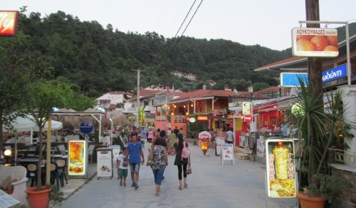 Ezzel ellentétben az öböl két szélén minden csillog-villog, bazárok sora tele mindennel, ami nem kell és vendéglő vendéglő után. Egyesek tömve, nem kapsz egy helyet sem, mások kongnak az ürességtől. Mindenhonnan más-más zene szól. Játékautomaták zajonganak és mellettük piciny kápolna, ahová ájtatosan be-betérnek a görögök.
