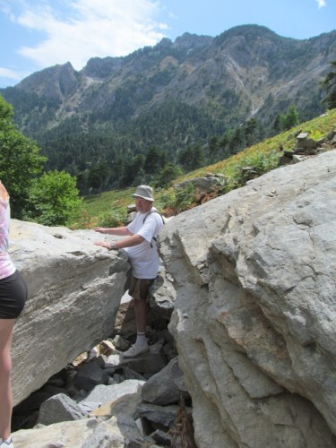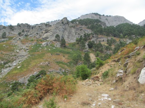 Gyönyörű platánok között haladunk. Az út fokozatosan emelkedik, de sajnos a hőmérséklet is vele együtt. A leírások nem túlzóak, nem könnyű sétálgatás: kidőlt fákon mászunk át, vízmosások, leszakadt utak. Sziklák között araszolunk át, be kell húzzam a pocakomat, hogy átférjek (mint fába szorult féreg - jut eszembe).