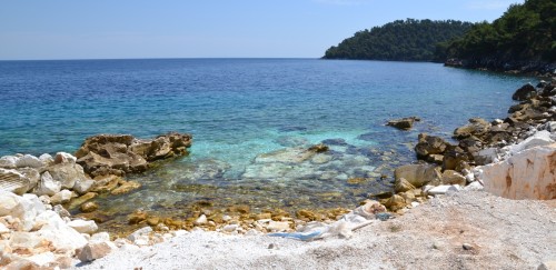 Visszafordulva hamar megtaláljuk a harmadik márványpartot. Egész nyaralásunk legszebb partjának bizonyul. Árnyékos homokos part, kristálytiszta víz. A vízben elszórtan sziklák, tele a helyi fauna összes képviselőjével: tengeri sünök, tengeri uborkák, tarisznyarákok, polip és medúza is látható. Sajnos képviseltetik magukat a darazsak is, sőt hatalmas vérszívó legyek is rászállnak nedves testünkre.