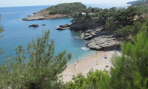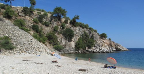Ennek ellenére, később megegyeztünk, hogy ez volt az egyik legszebb, legjobban tetsző partszakasz. Nincsenek sokan, a széleken, különleges formájú sziklákon árnyékot is találunk. A part köves, a tenger aránylag hamar mélyül. A vízben lévő nagy kövek csúszósak. Bátran lépek az egyikre és elegánsan hanyatt vágom magam. Ennek következményeként földrengés és kisebb cunami pusztítja a partot.